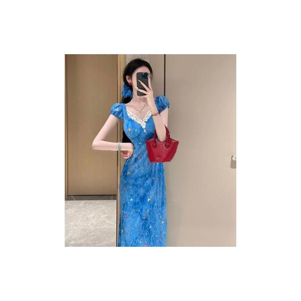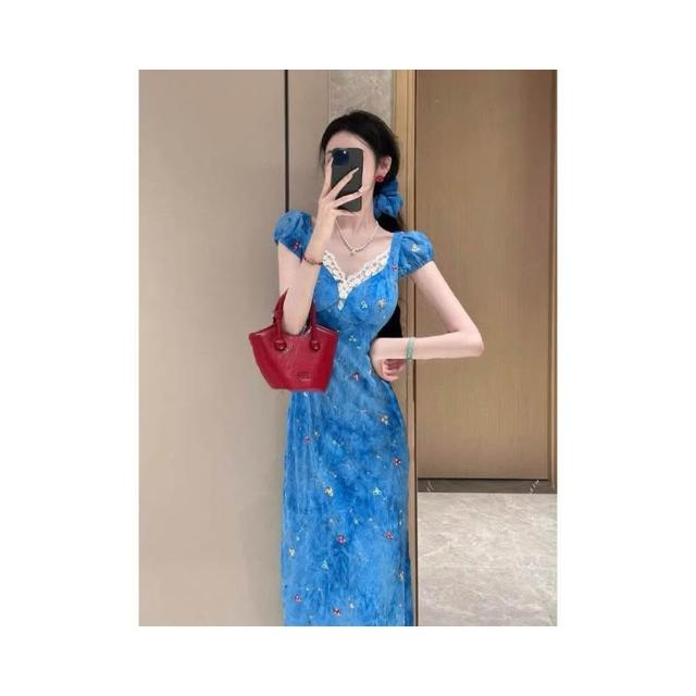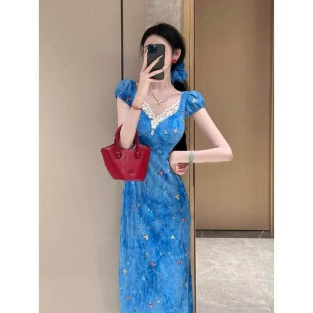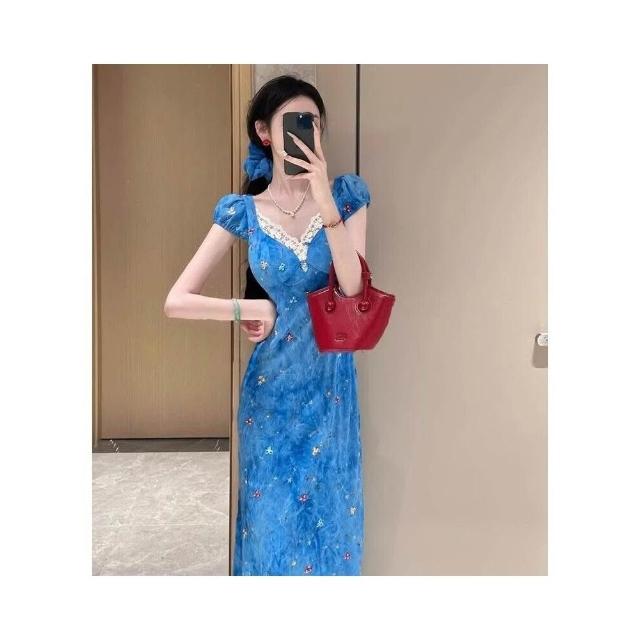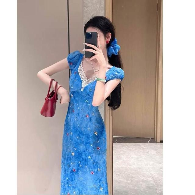 新品 含發票 純欲辣妹設計感V領碎花連衣裙女夏季新款修身顯瘦感包臀長裙