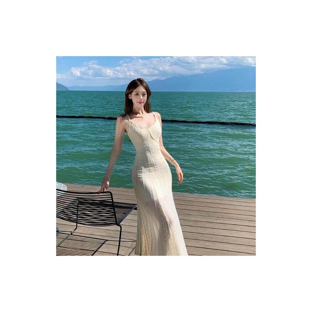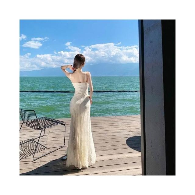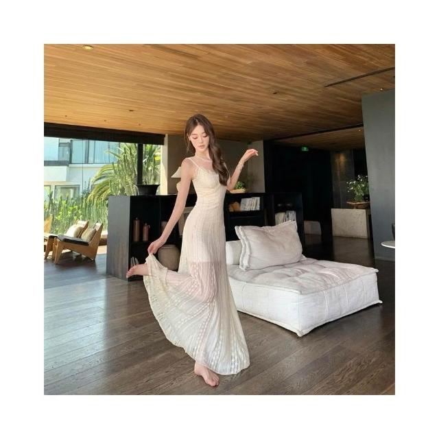 新品 含發票 純欲風白色蕾絲拼接吊帶連衣裙女2025新款夏季超好看獨特漂亮長裙