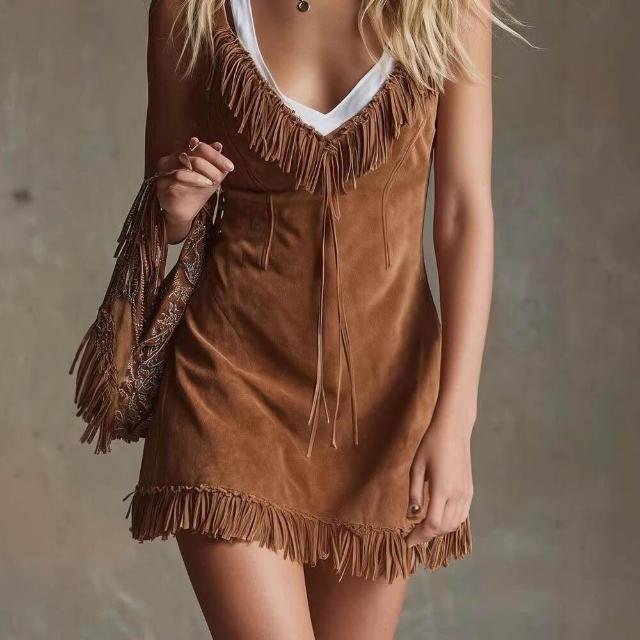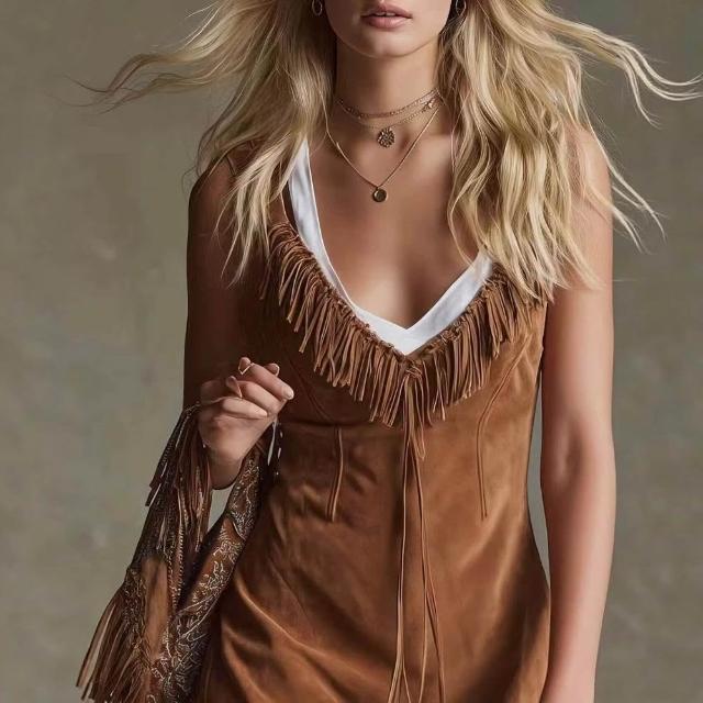 新品 含發票 2026跨境歐美春夏女裝復古麂皮絨褶皺收腰V領流蘇吊帶連衣裙