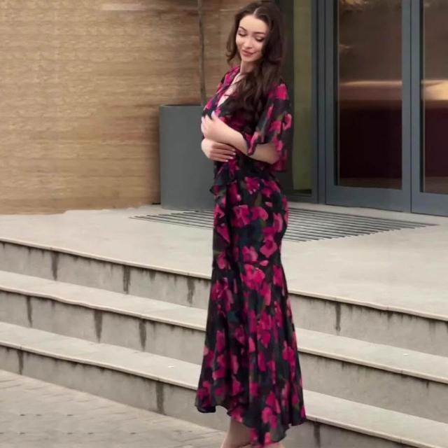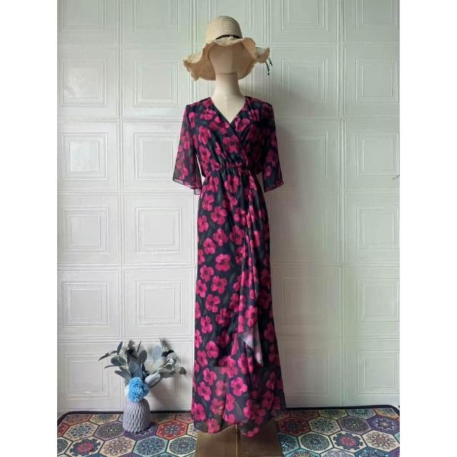 新品 含發票 歐美亞馬遜跨境2025夏季新款復古性感v領短袖長裙艷麗連衣裙女