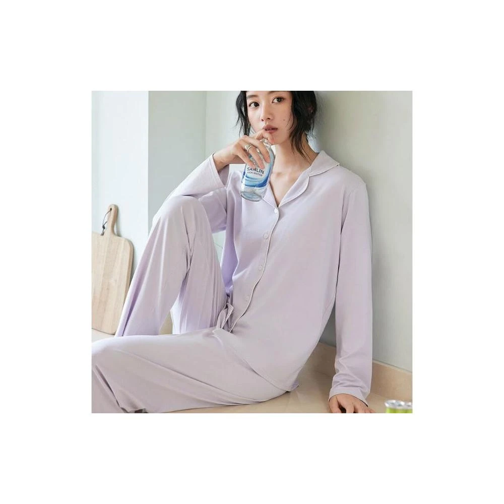 新品 含發票 春夏桑蠶絲家居服女2025新款紐扣寬松長袖睡衣純色外穿翻領套裝