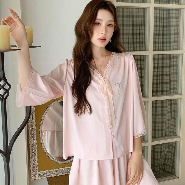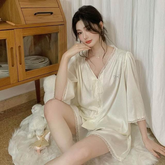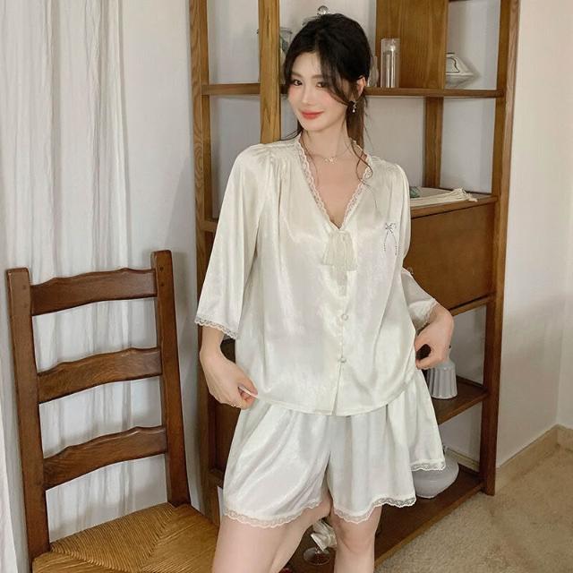 新品 含發票 法式新款睡衣純色V領女士性感寬松高級感夏季短袖短褲睡衣可外穿