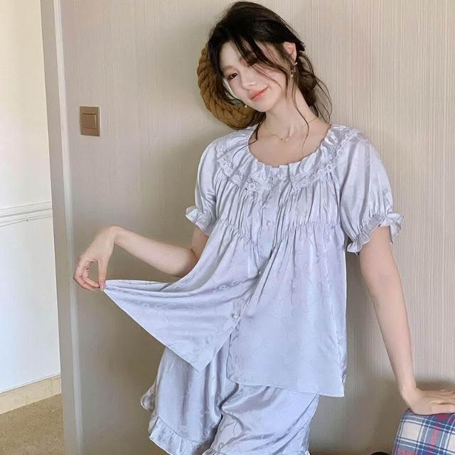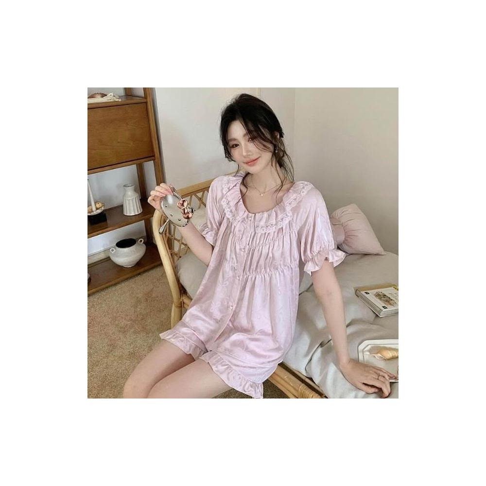 新品 含發票 法式新款睡衣夏季甜美花邊提花寬松短袖套裝睡衣夏季家居服新款女