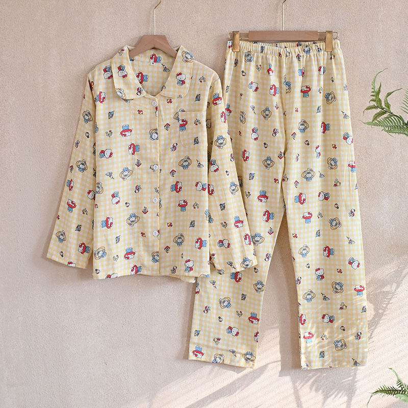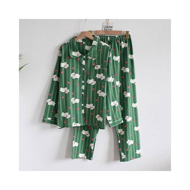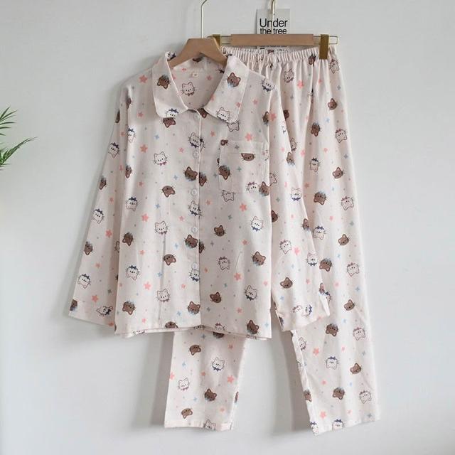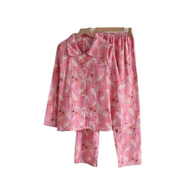 新品 含發票 韓版睡衣女春秋冬薄款全棉卡通開衫長袖長褲翻領全棉磨毛家居服套