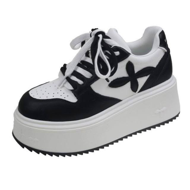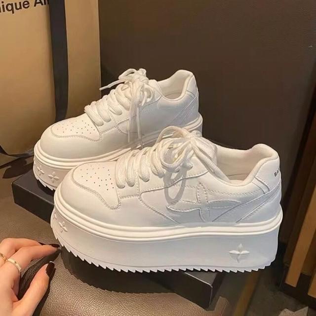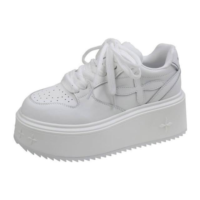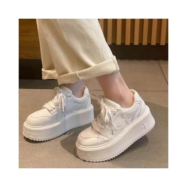 新品 含發票 厚底真皮圓頭小白鞋女2025春季新款松糕底增高高跟系帶休閑板鞋女