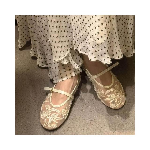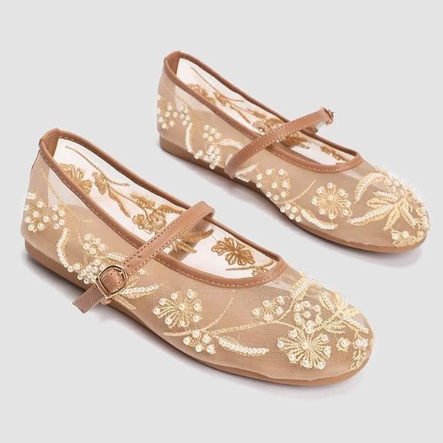 新品 含發票 刺繡珍珠網眼芭蕾舞鞋女時尚镂空網紗圓頭平底一字扣帶瑪麗珍單鞋