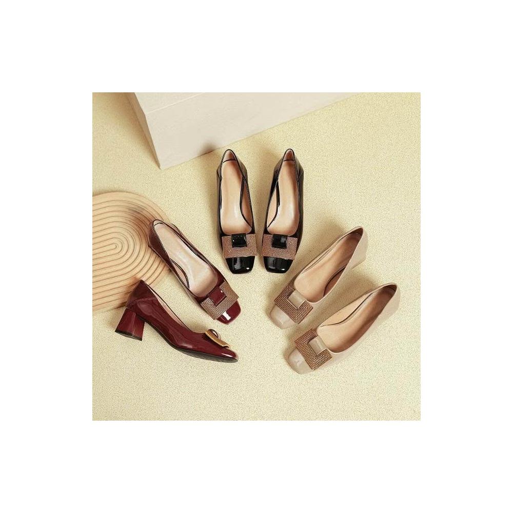新品 含發票 粗跟高跟鞋不累腳2025新款紅色婚鞋中跟春秋女鞋漆皮方頭淺口單鞋