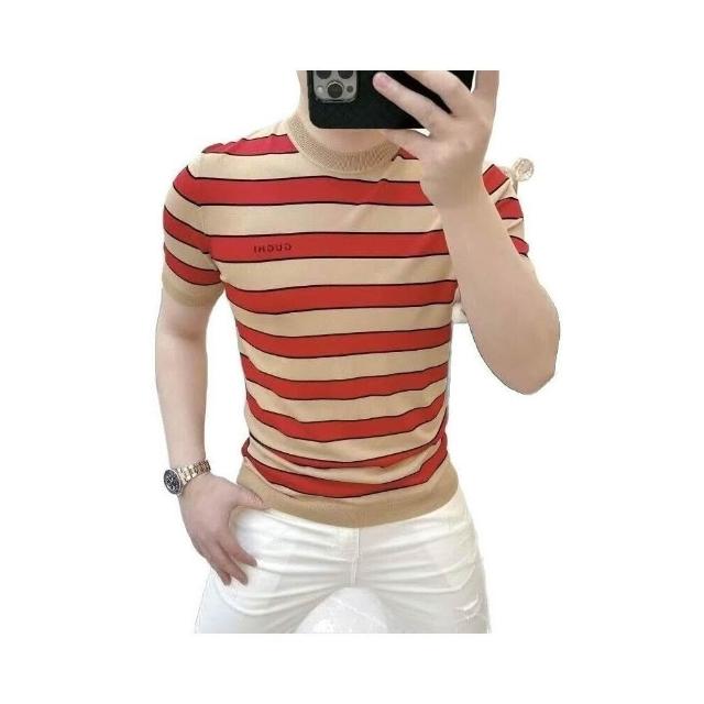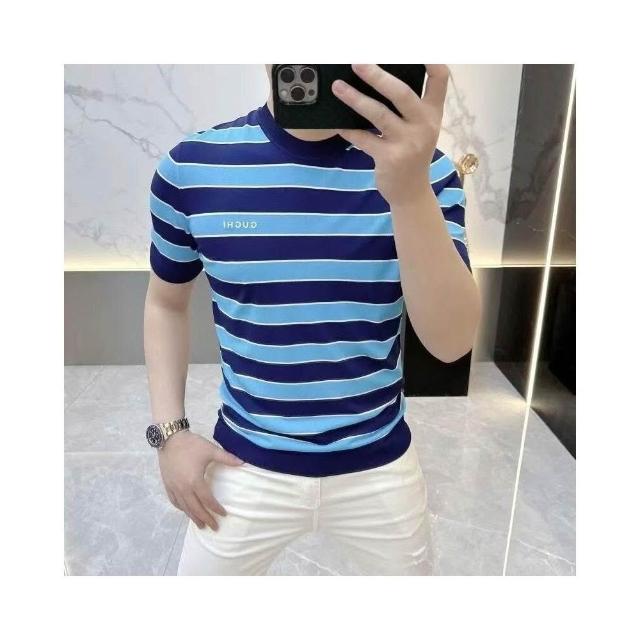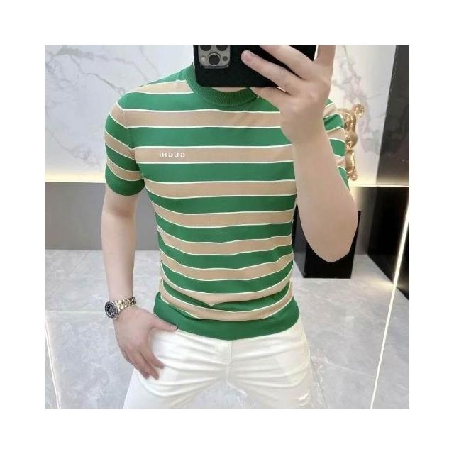 新品 含發票 歐貨輕奢新款條紋男士t恤夏休閑伊力特上衣薄款透氣圓領t恤短袖男