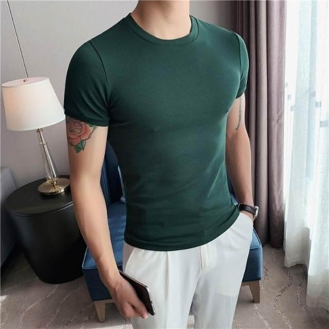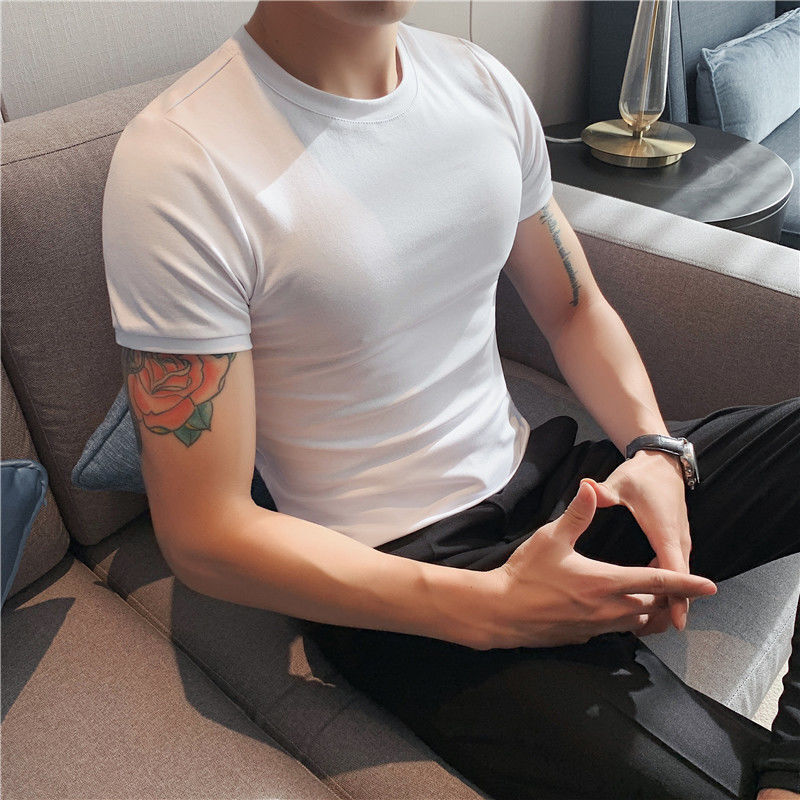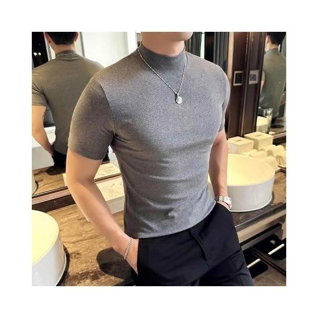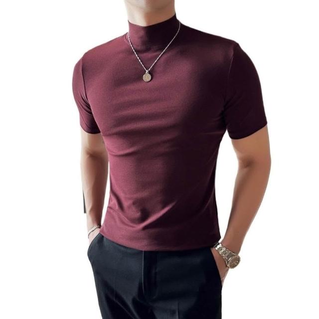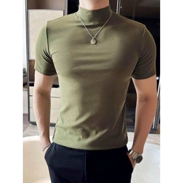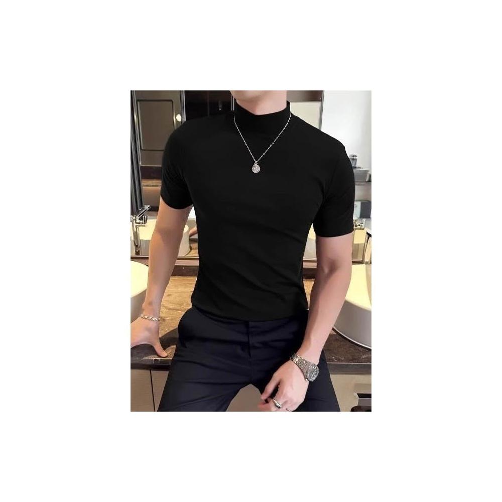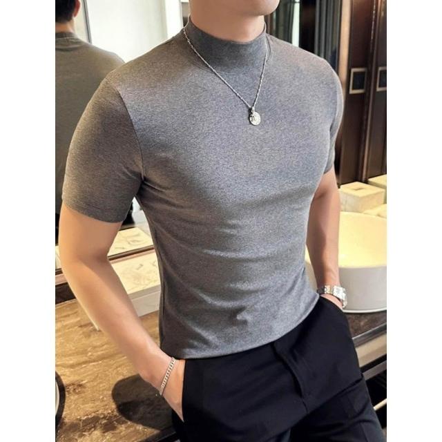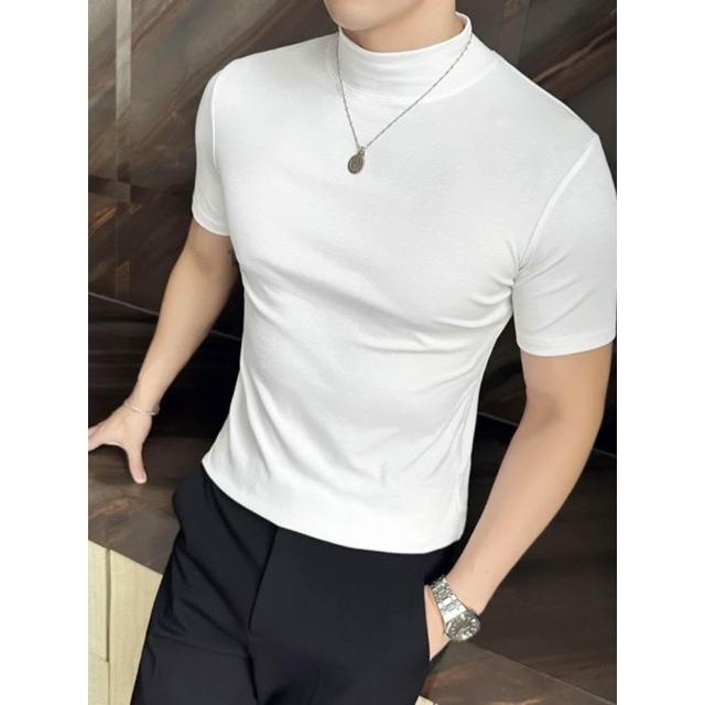 新品 含發票 高級感半高領短袖韓版修身百搭中領純色打底衫男彈力潮流黑色T恤