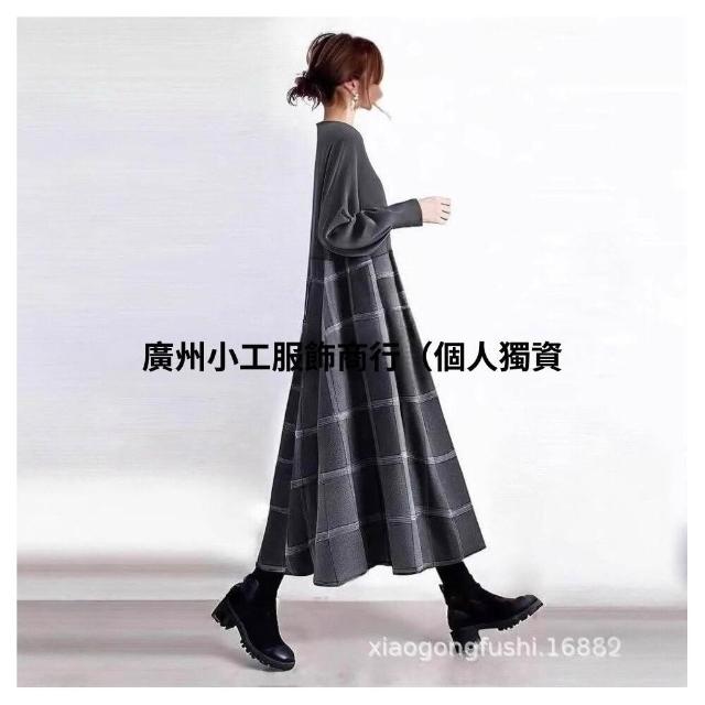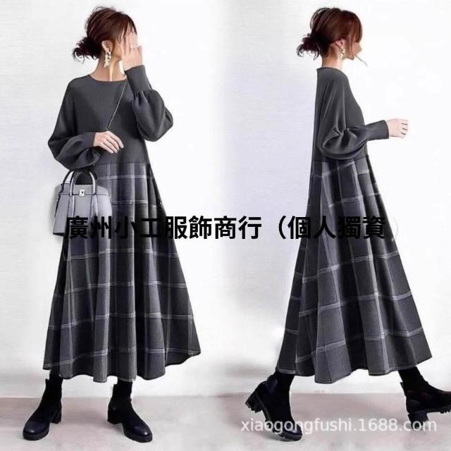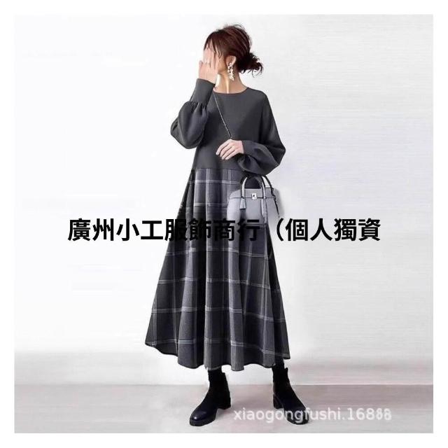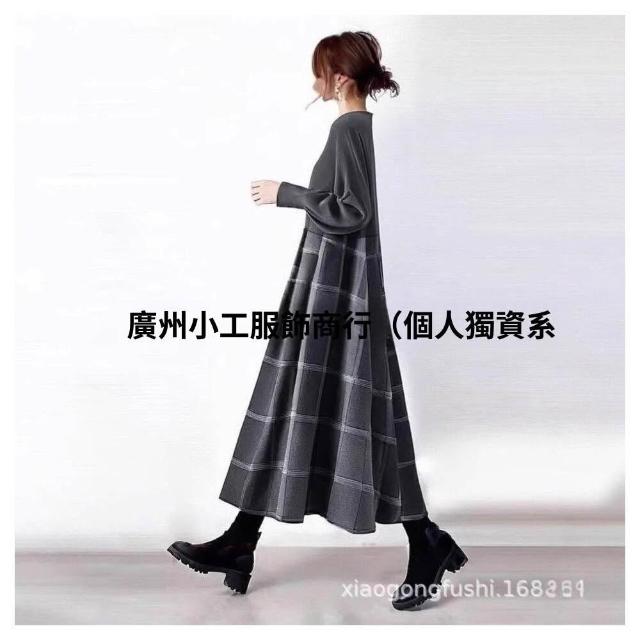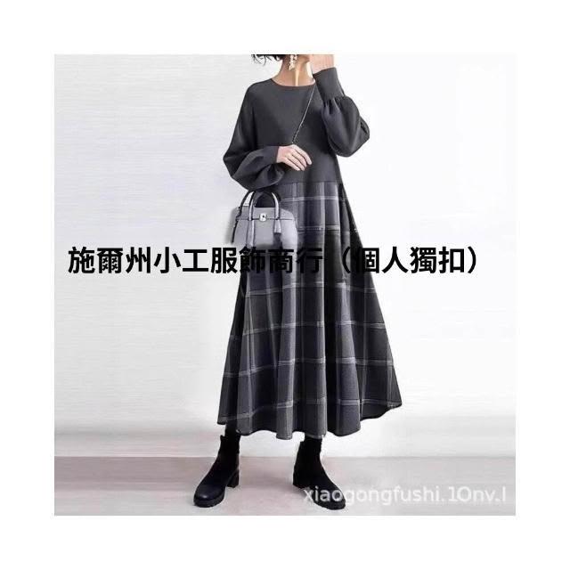 新品 含發票 跨境日韓秋季新款女裝 格子拼接寬松顯瘦假兩件中長款連衣裙A字裙