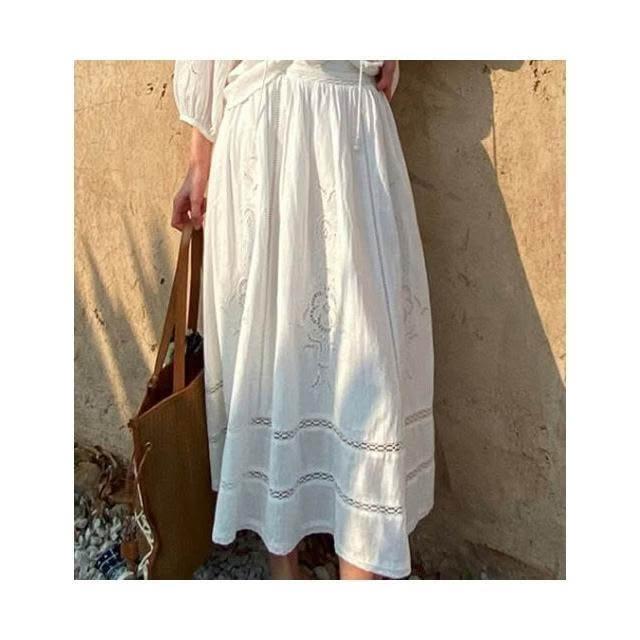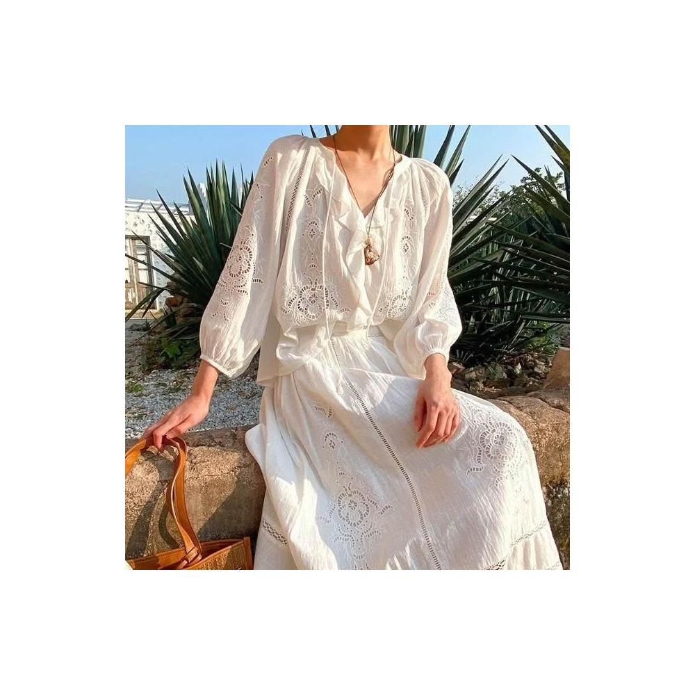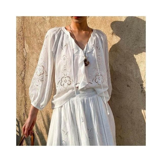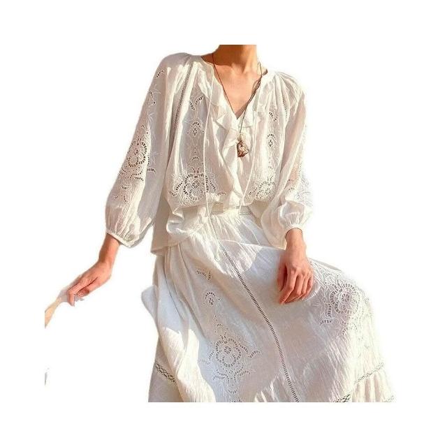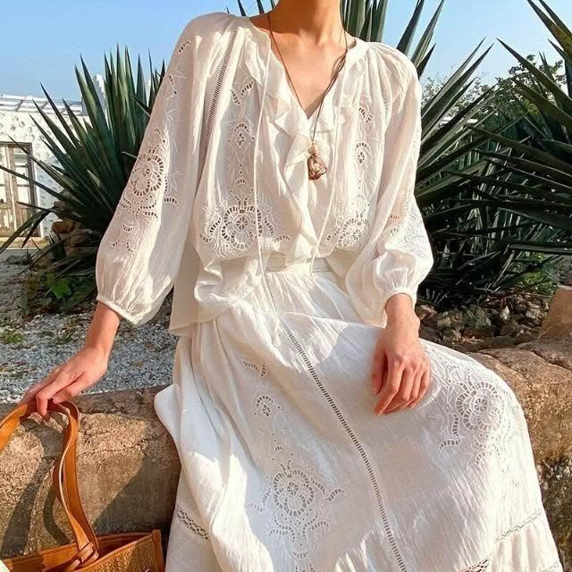新品 含發票 春夏新款法式小衫度假镂空上衣+刺繡半身裙中長裙外貿跨境女裝夏