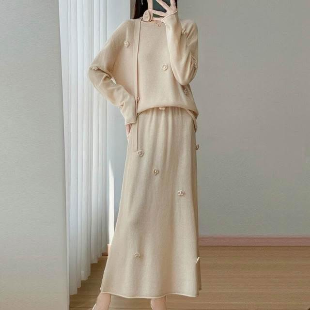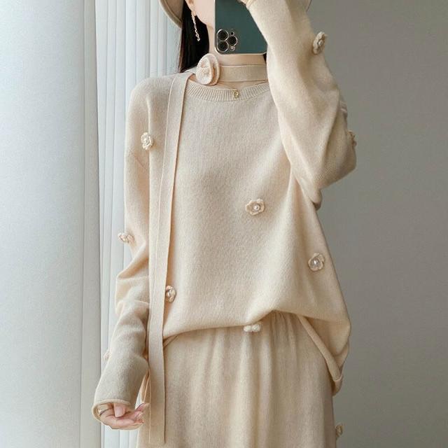 新品 含發票 100絲光羊毛兩件套女式圓領針織裙套裝秋冬新款鉤花設計毛衣裙子