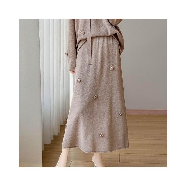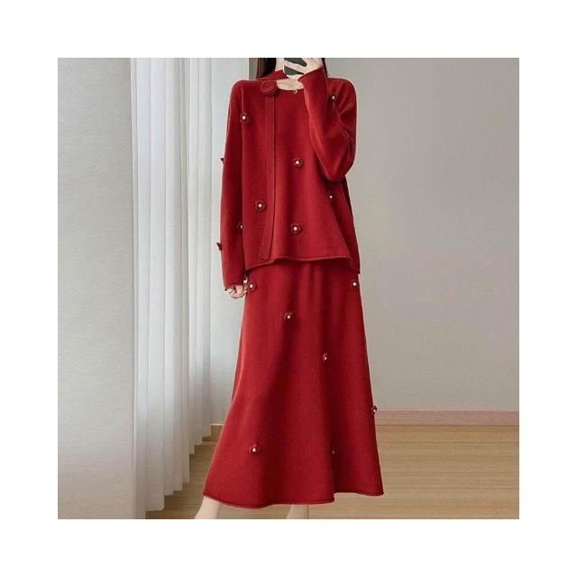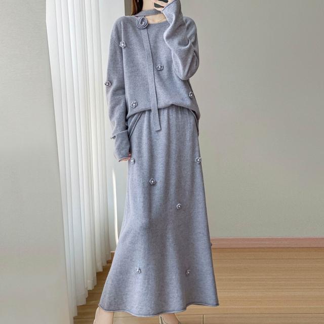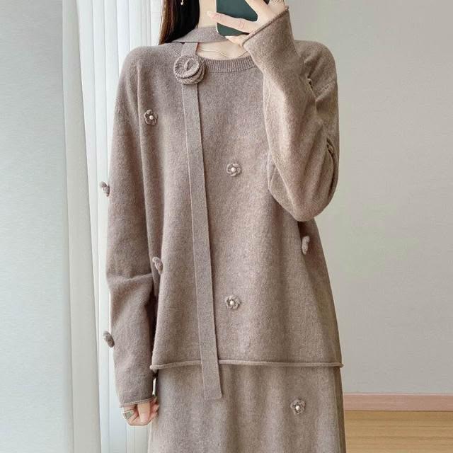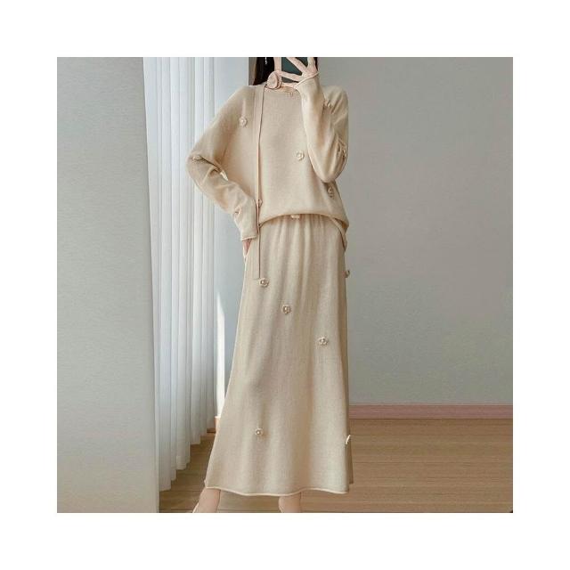 新品 含發票 100絲光羊毛兩件套女式圓領針織裙套裝秋冬新款鉤花設計毛衣裙子