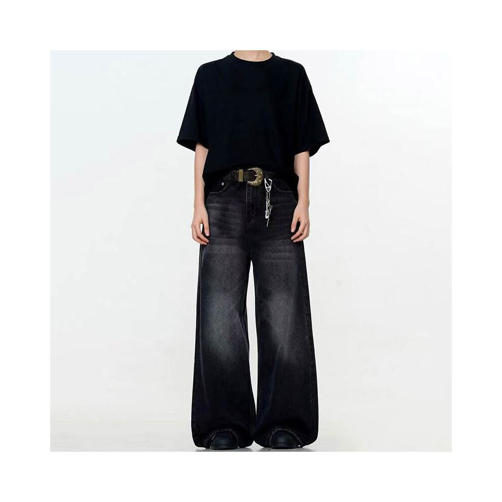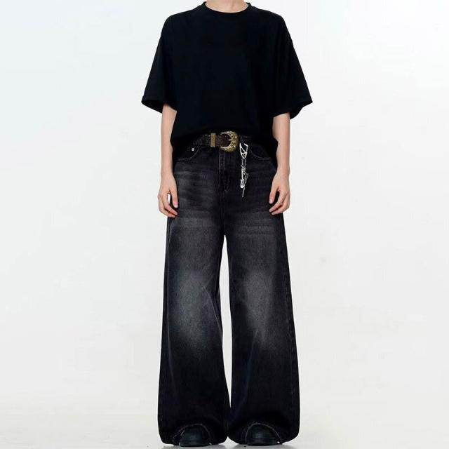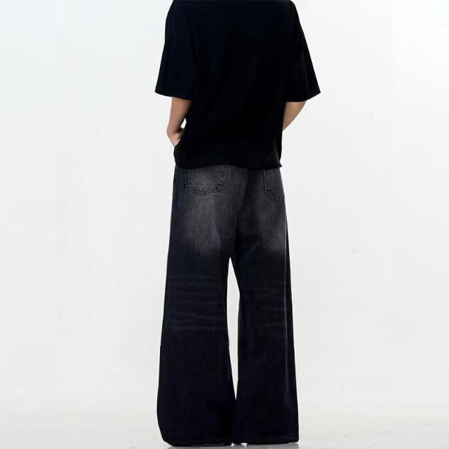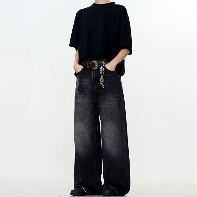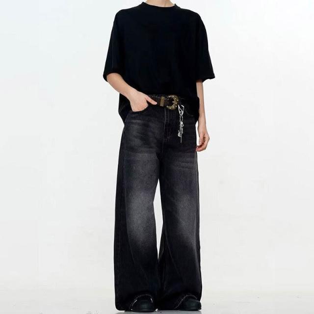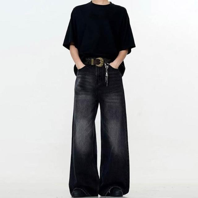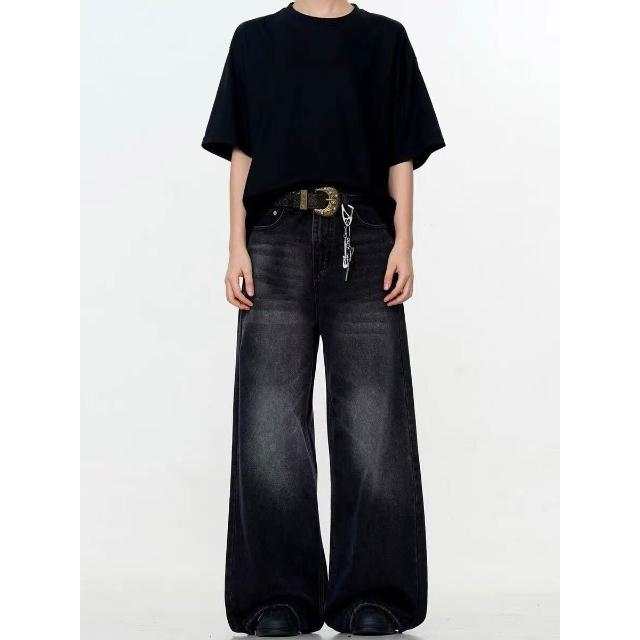 新品 含發票 美式高街寬松闊腿男士牛仔褲復古水洗做舊潮牌黑色直筒拖地褲子女