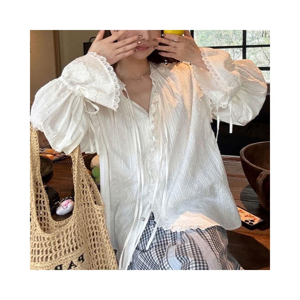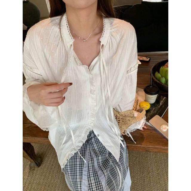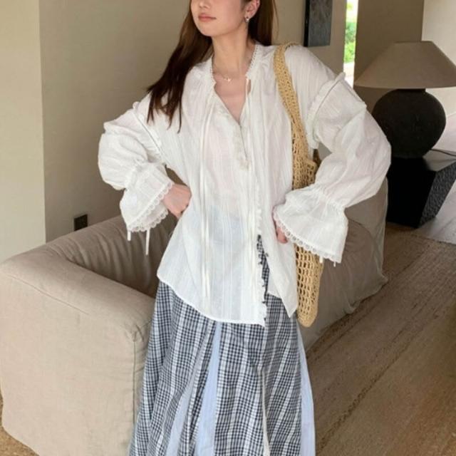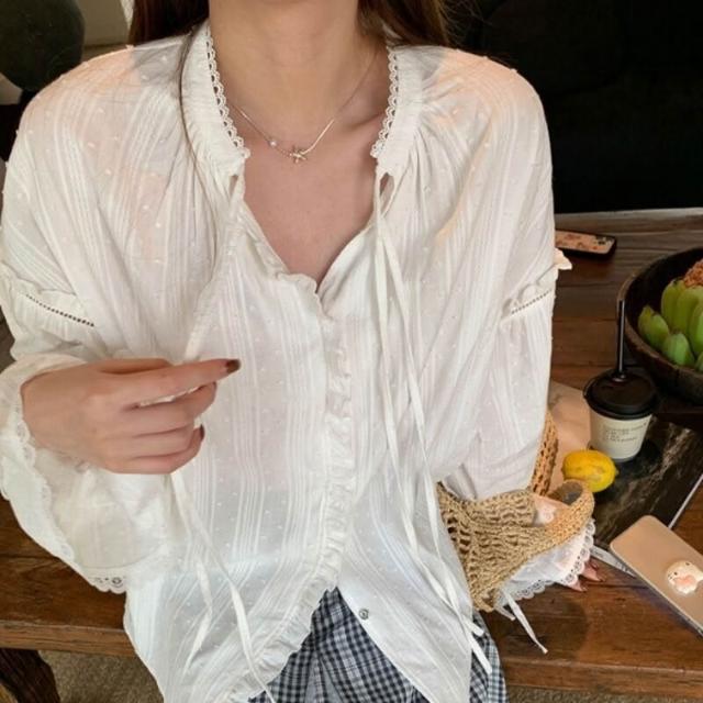 新品 含發票 棉蕾絲拼接木耳邊提花襯衫女春系帶喇叭袖上衣2026春新