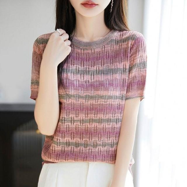 新品 含發票 2025年春夏新款精紡羊毛圓領針織衫短袖T恤女彩虹條紋镂空打底衫