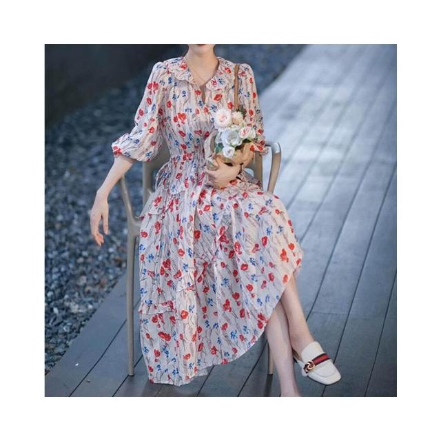 新品 含發票 2026春夏新款法式復古茶歇仙女減齡長裙氣質收腰顯瘦碎花連衣裙子