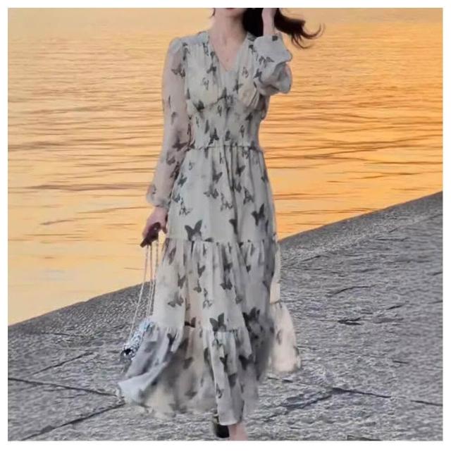 新品 含發票 2026春秋新款茶歇法式溫柔碎花顯瘦收腰連衣裙度假風V領仙女長裙