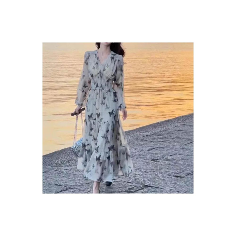 新品 含發票 2026春秋新款茶歇法式溫柔碎花顯瘦收腰連衣裙度假風V領仙女長裙