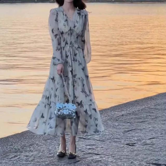 新品 含發票 2026春秋新款茶歇法式溫柔碎花顯瘦收腰連衣裙度假風V領仙女長裙