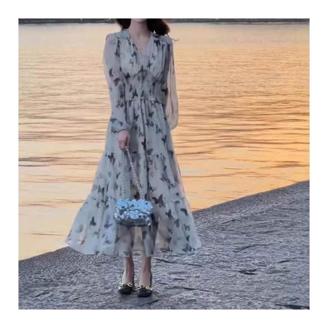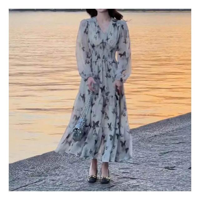 新品 含發票 2026春秋新款茶歇法式溫柔碎花顯瘦收腰連衣裙度假風V領仙女長裙