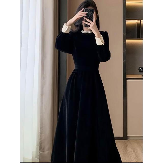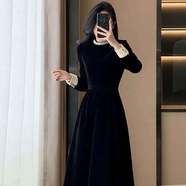 新品 含發票 赫本風絲絨襯衫袖小黑裙女高端精致大方得體連衣裙法式打底長裙秋