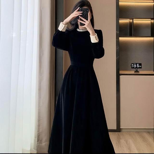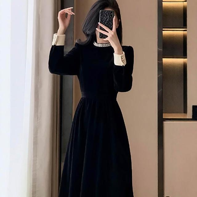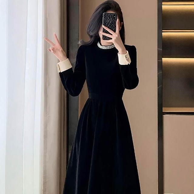新品 含發票 赫本風絲絨襯衫袖小黑裙女高端精致大方得體連衣裙法式打底長裙秋