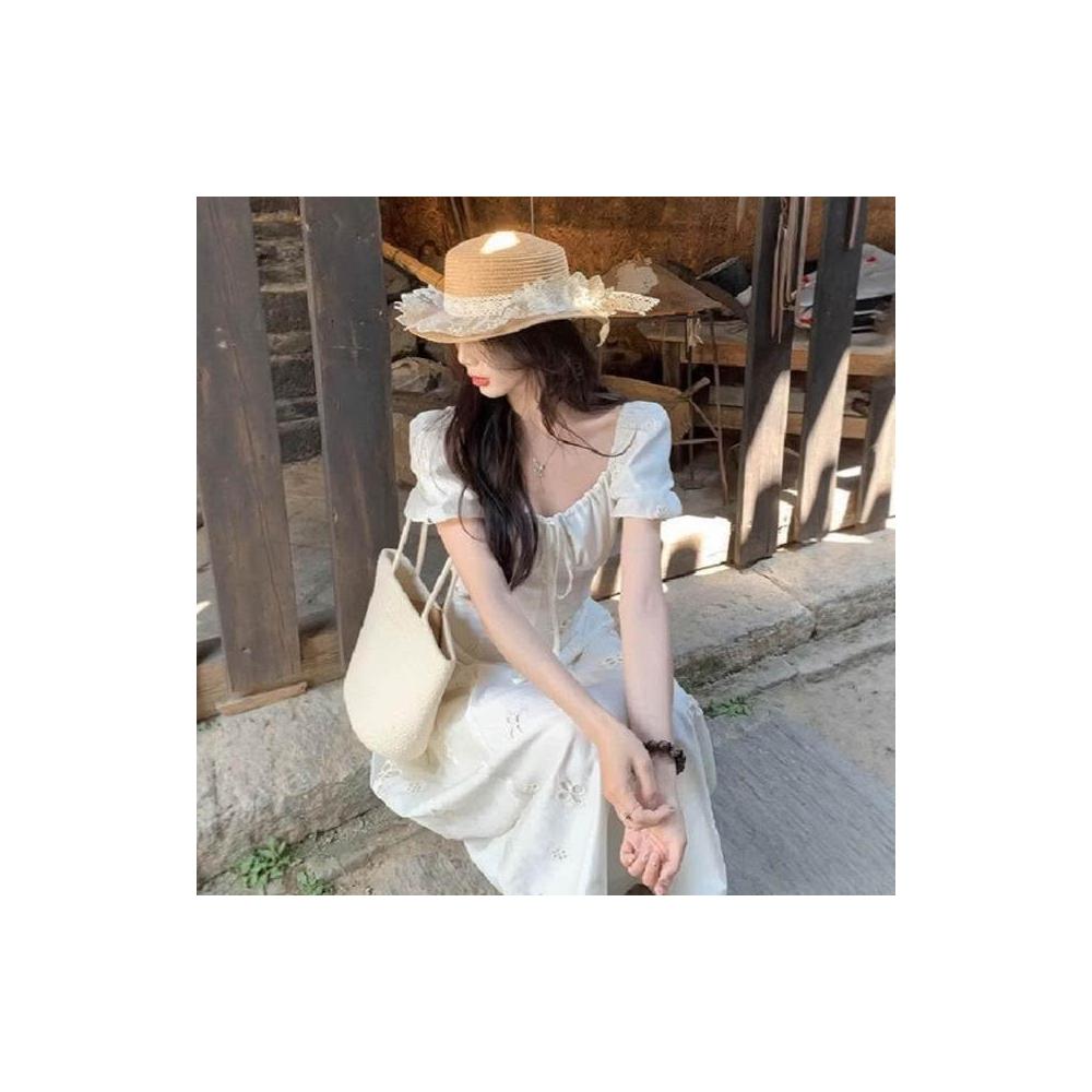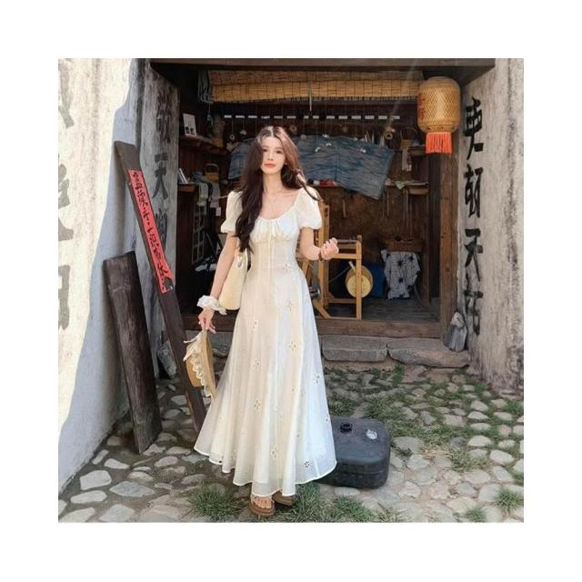 新品 含發票 溫柔風泡泡袖系帶方領連衣裙子女繡花镂空設計感法式氣質長裙夏季