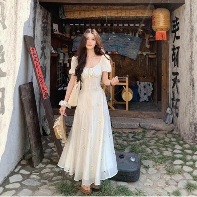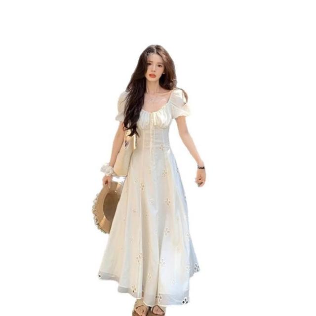新品 含發票 溫柔風泡泡袖系帶方領連衣裙子女繡花镂空設計感法式氣質長裙夏季