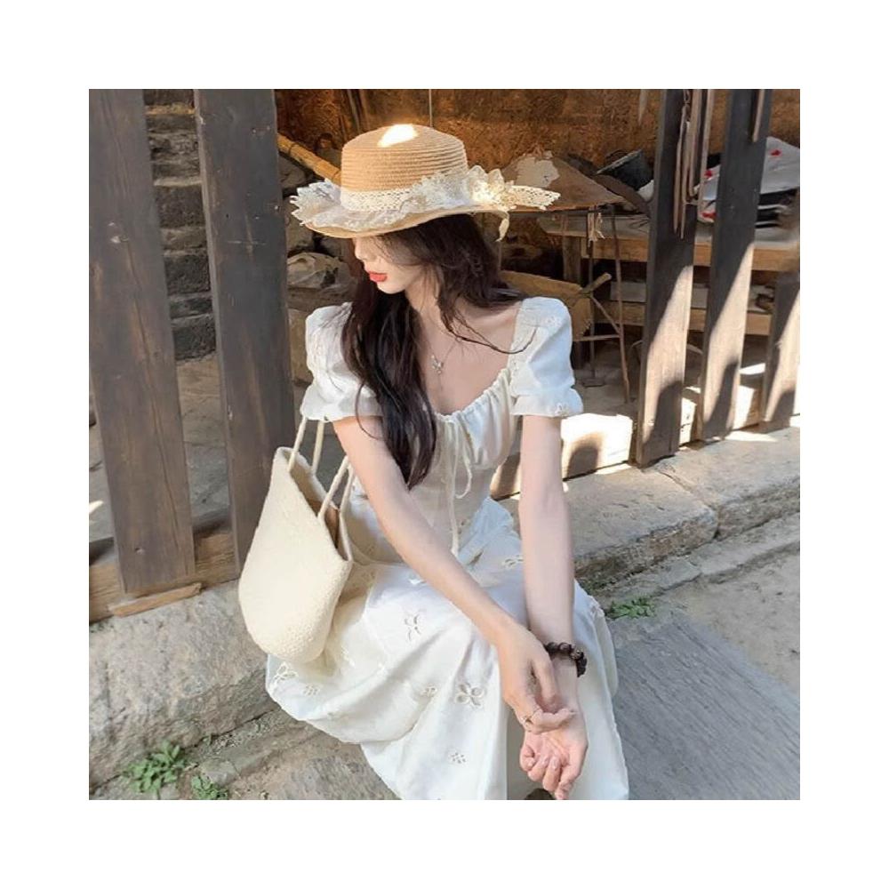 新品 含發票 溫柔風泡泡袖系帶方領連衣裙子女繡花镂空設計感法式氣質長裙夏季