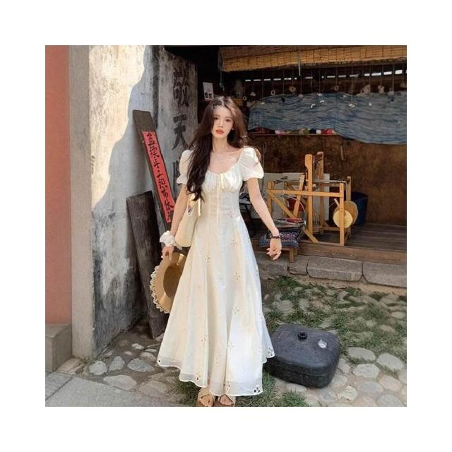 新品 含發票 溫柔風泡泡袖系帶方領連衣裙子女繡花镂空設計感法式氣質長裙夏季