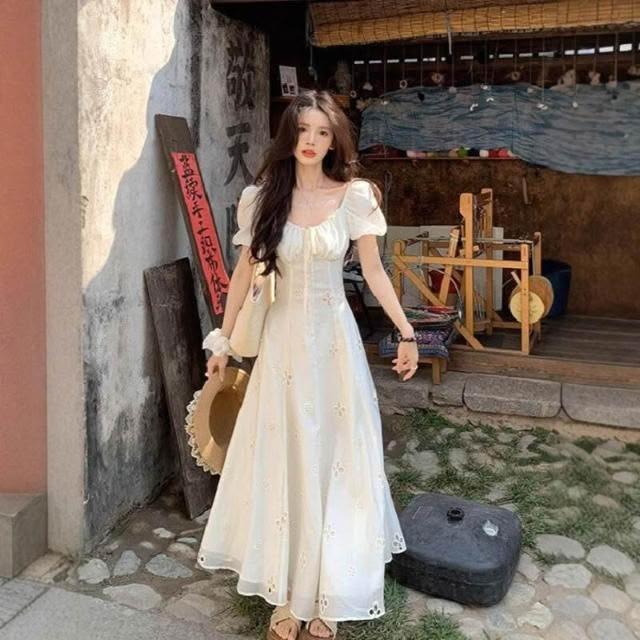 新品 含發票 溫柔風泡泡袖系帶方領連衣裙子女繡花镂空設計感法式氣質長裙夏季
