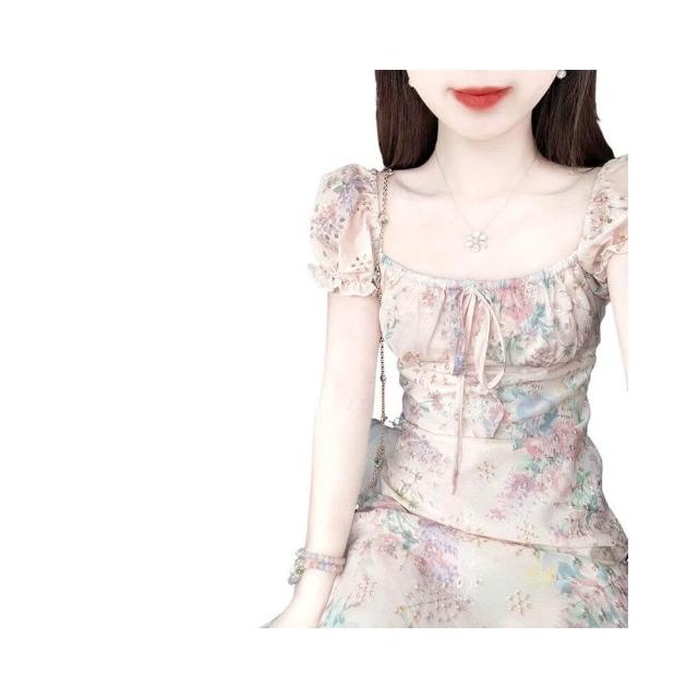 新品 含發票 2026夏裝法式溫柔風刺繡碎花連衣裙女泡泡袖桔梗修身顯瘦氣質長裙