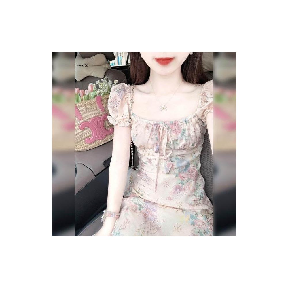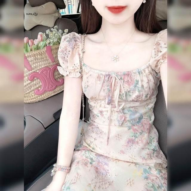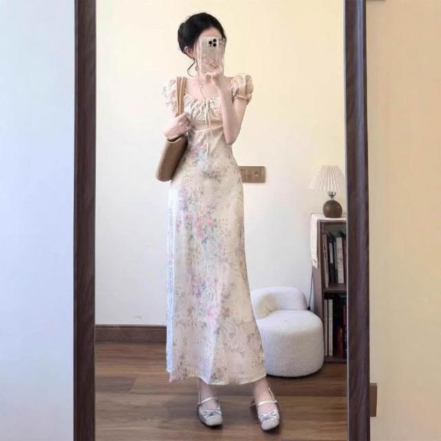 新品 含發票 2026夏裝法式溫柔風刺繡碎花連衣裙女泡泡袖桔梗修身顯瘦氣質長裙
