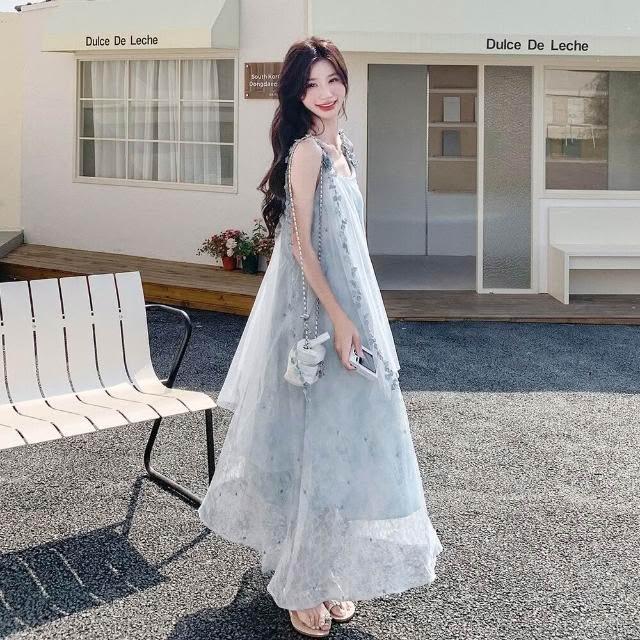 新品 含發票 法式超仙立體花朵吊帶連衣裙女2025夏季海邊度假絕美網紗碎花長裙
