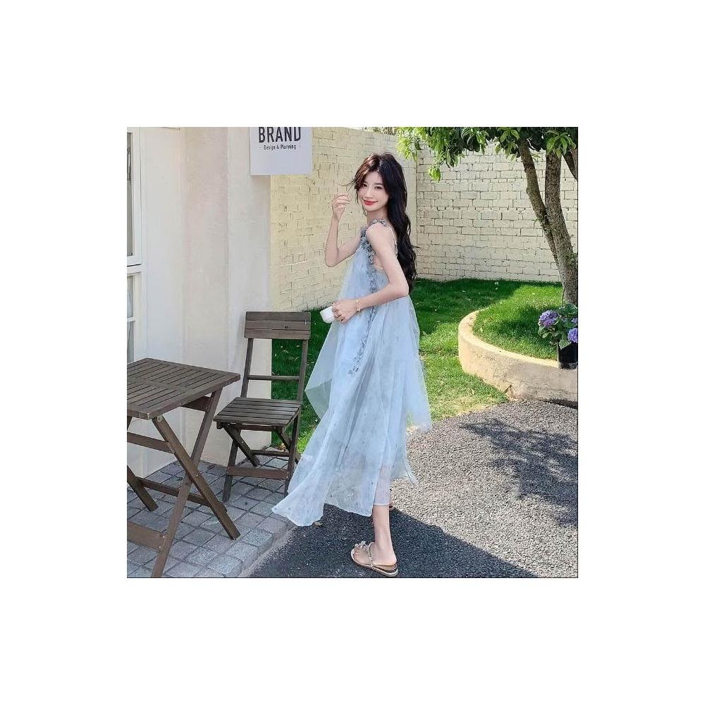 新品 含發票 法式超仙立體花朵吊帶連衣裙女2025夏季海邊度假絕美網紗碎花長裙