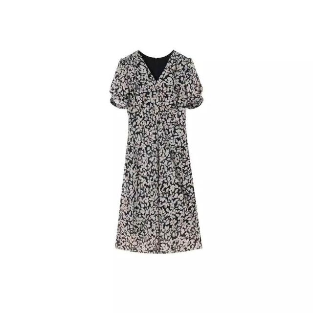 新品 含發票 優雅通勤黑白碎花茶歇裙法式V領泡泡袖收腰顯瘦連衣裙15629