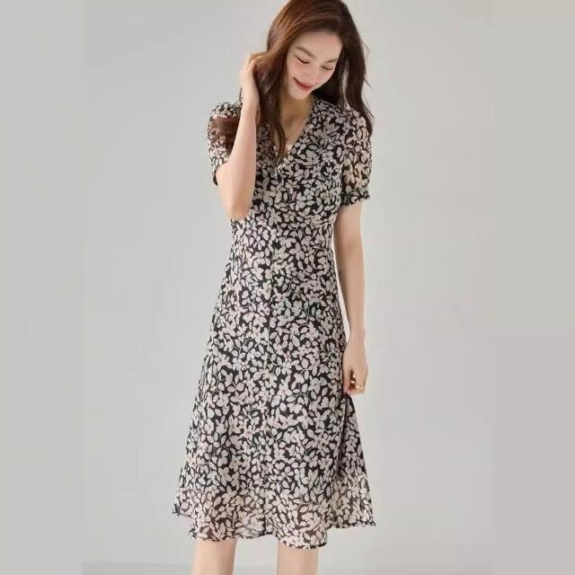 新品 含發票 優雅通勤黑白碎花茶歇裙法式V領泡泡袖收腰顯瘦連衣裙15629
