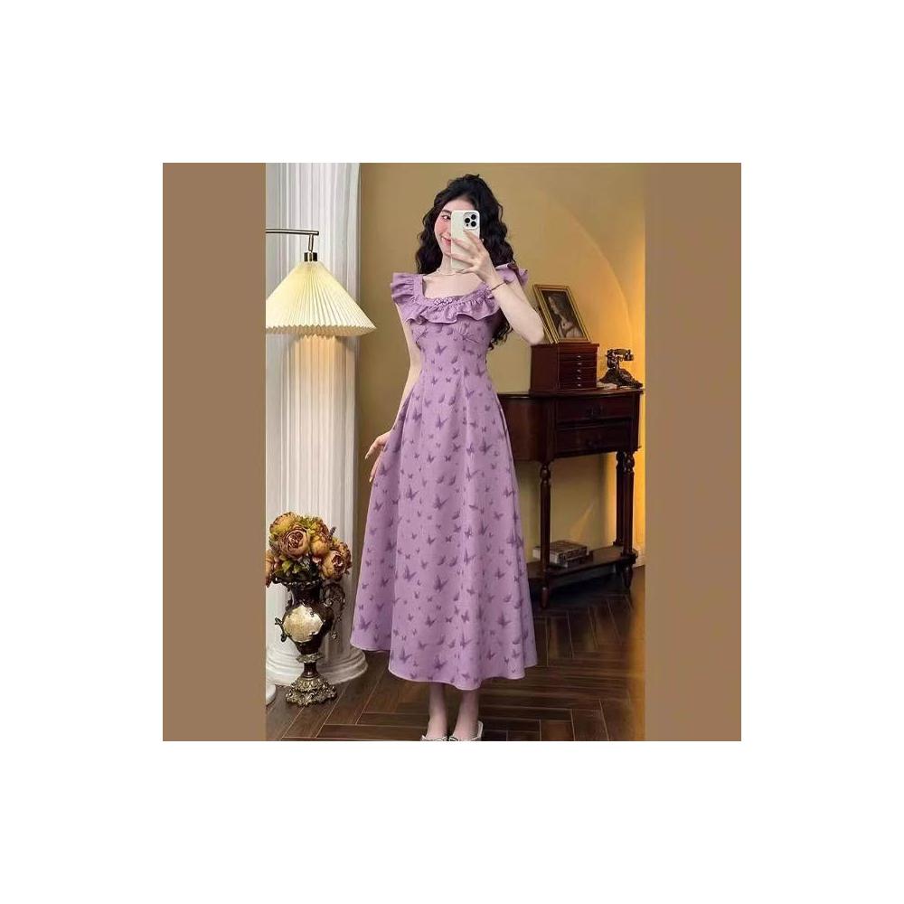 新品 含發票 法式復古方領長裙女2025夏季新款溫柔風顯瘦小飛袖紫色碎花連衣裙