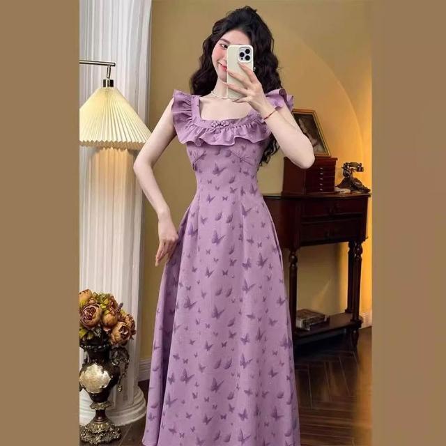 新品 含發票 法式復古方領長裙女2025夏季新款溫柔風顯瘦小飛袖紫色碎花連衣裙
