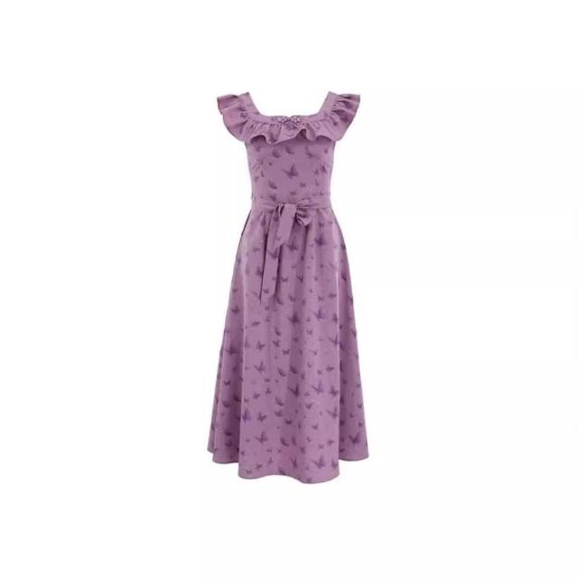 新品 含發票 法式復古方領長裙女2025夏季新款溫柔風顯瘦小飛袖紫色碎花連衣裙
