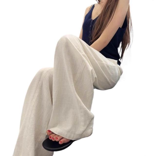 新品 含發票 白色亞麻闊腿褲女夏季薄款高腰垂感老錢風休閑直筒冰絲棉麻西裝褲