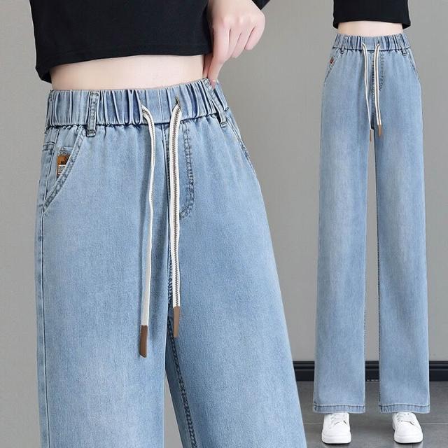 新品 含發票 春秋款上新闊腿直筒褲女裝牛仔長褲松緊腰彈力修身潮流淺色牛仔褲
