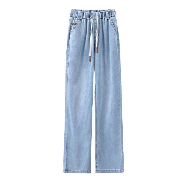 新品 含發票 春秋款上新闊腿直筒褲女裝牛仔長褲松緊腰彈力修身潮流淺色牛仔褲