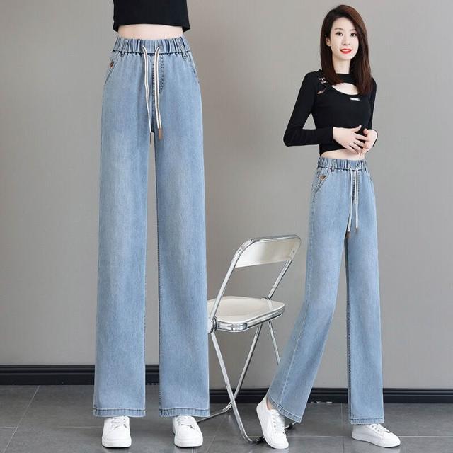 新品 含發票 春秋款上新闊腿直筒褲女裝牛仔長褲松緊腰彈力修身潮流淺色牛仔褲