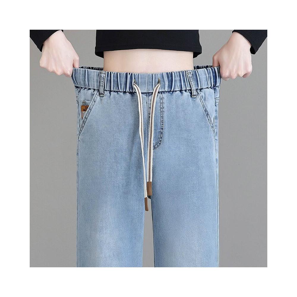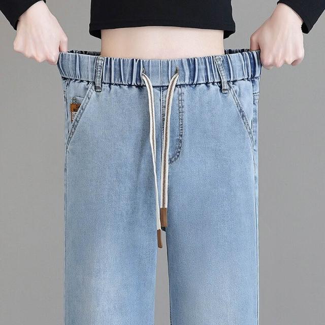 新品 含發票 春秋款上新闊腿直筒褲女裝牛仔長褲松緊腰彈力修身潮流淺色牛仔褲
