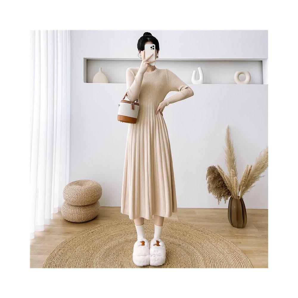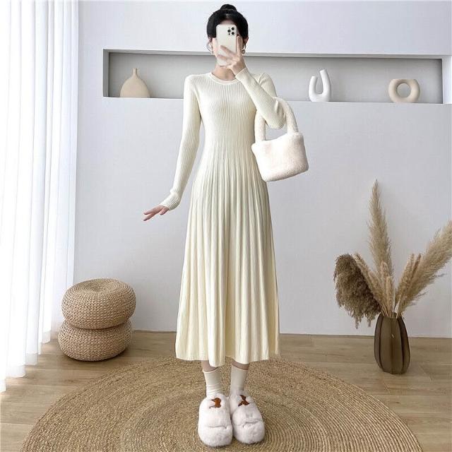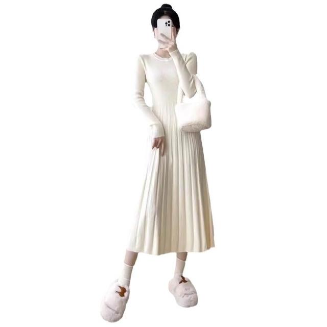 新品 含發票 韓版連衣裙中長款顯瘦針織洋裝女秋季新款長袖收腰打底毛衣裙長裙