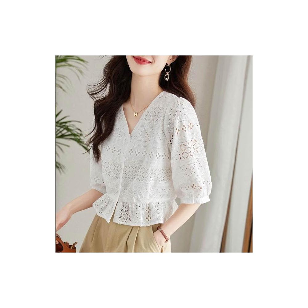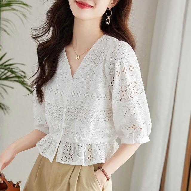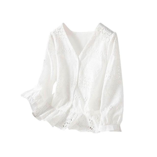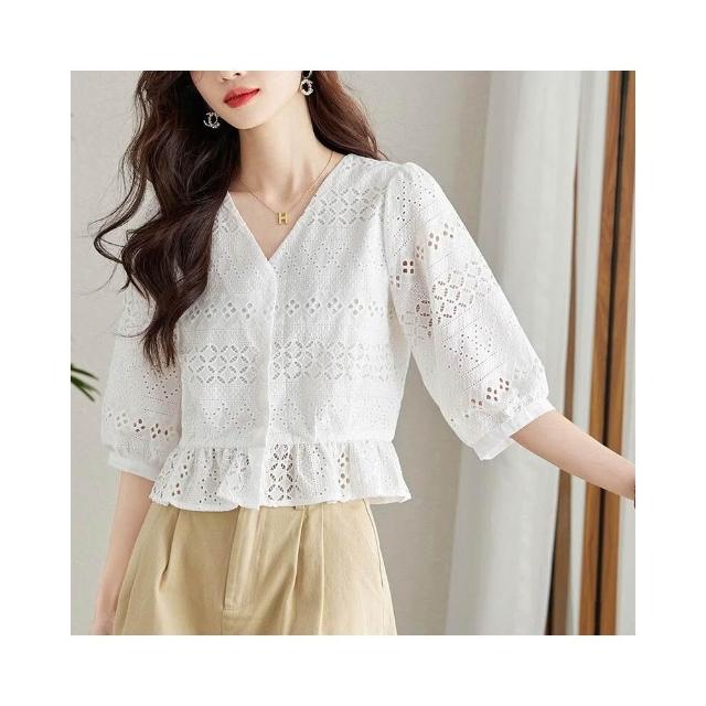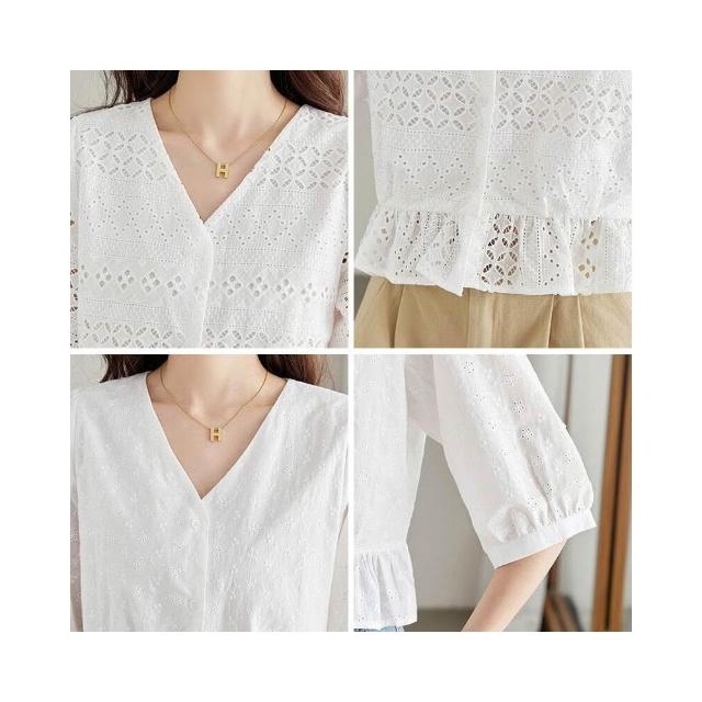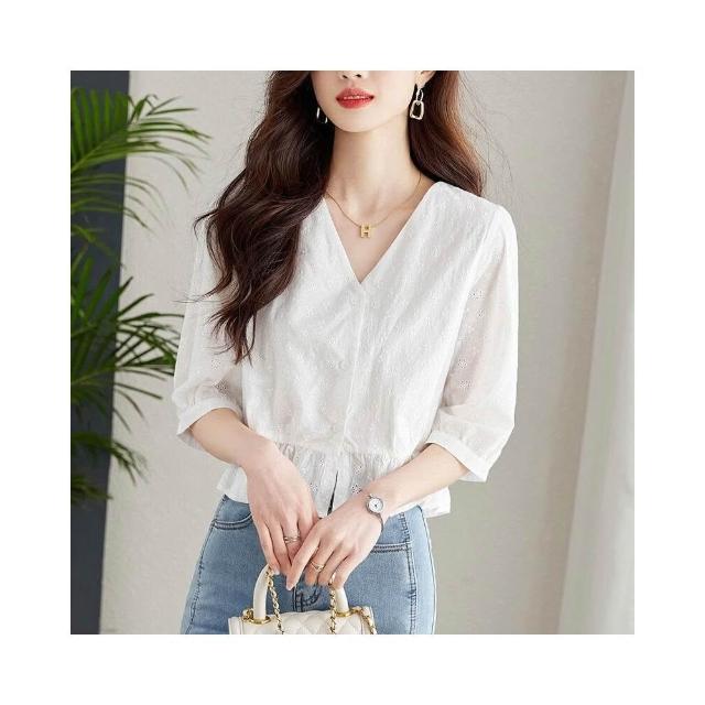 新品 含發票 棉繭 繡花镂空白襯衫女五分袖2026夏季小個子短款上衣純棉v領襯衣