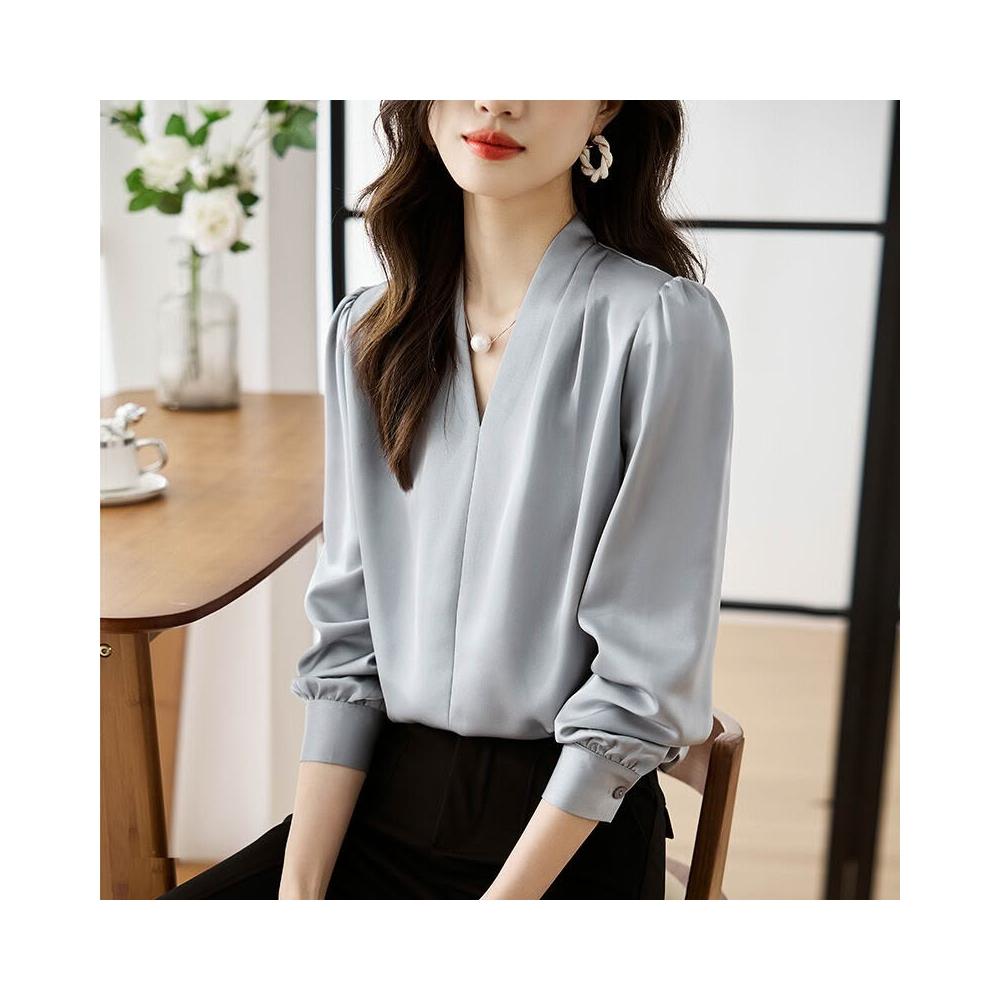 新品 含發票 嚴選 高級感簡約襯衫女春季氣質V領輕熟風通勤醋酸緞面雪紡衫上衣