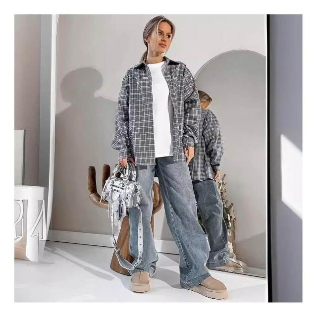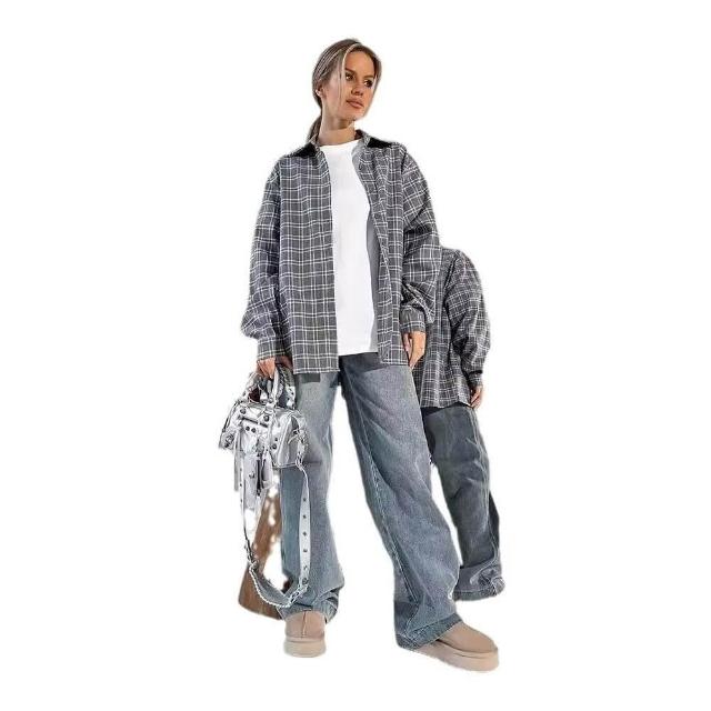 新品 含發票 2024歐美春秋新款灰色氣質格紋oversize寬松翻領女式襯衫時尚女裝